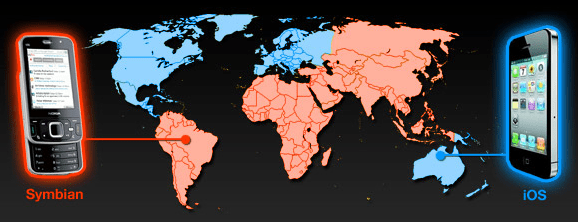 Kao što se može videti, vodeće dva operativna sistema su Applov iOS i Nokia Symbian. Apple vodi u Severnoj Americi, Evropi i Okeaniji, dok Nokia “drži” Afriku, Aziju i Južnu Ameriku.
