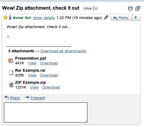 Evo jedna odlična vest za sve vas koji se plašite preuzimati poštu u kojoj se nalazi neka arhiva, tj. zapakovani fajlovi. Od danas, možete da pregledate arhivu pre preuzimanja klikom na dugme “View” pored attachmenta u gmailu.