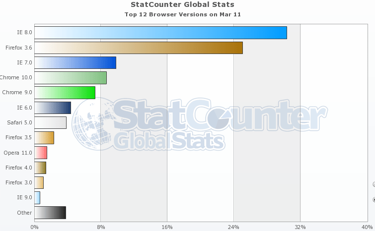 Statcounter, popularni sajt za globalne statistike upotrebe veb brauzera je upravo objavio da je Firefox 4 već pretekao IE 9 po upotrebi na globalnom nivou, i tako sada Firefox 4 već ima 1,38% udela u tržištu dok je IE 9 daleko iza sa svega 0,66%