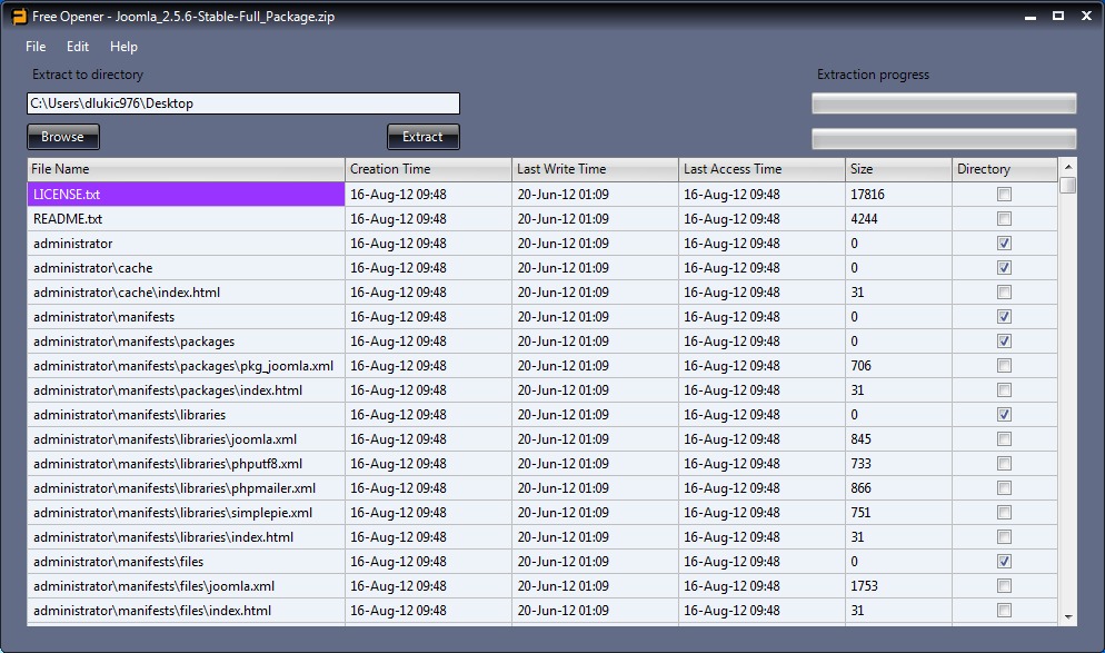 Free Opener otvara i arhive, uključujući tu RAR, 7z, JAR, GZ, TAR, TGZ i ZIP. Pored pregleda sadržaja arhive imate mogućnost da istu otpakujete (Extract) uz podešavanje odgovarajućeg foldera.